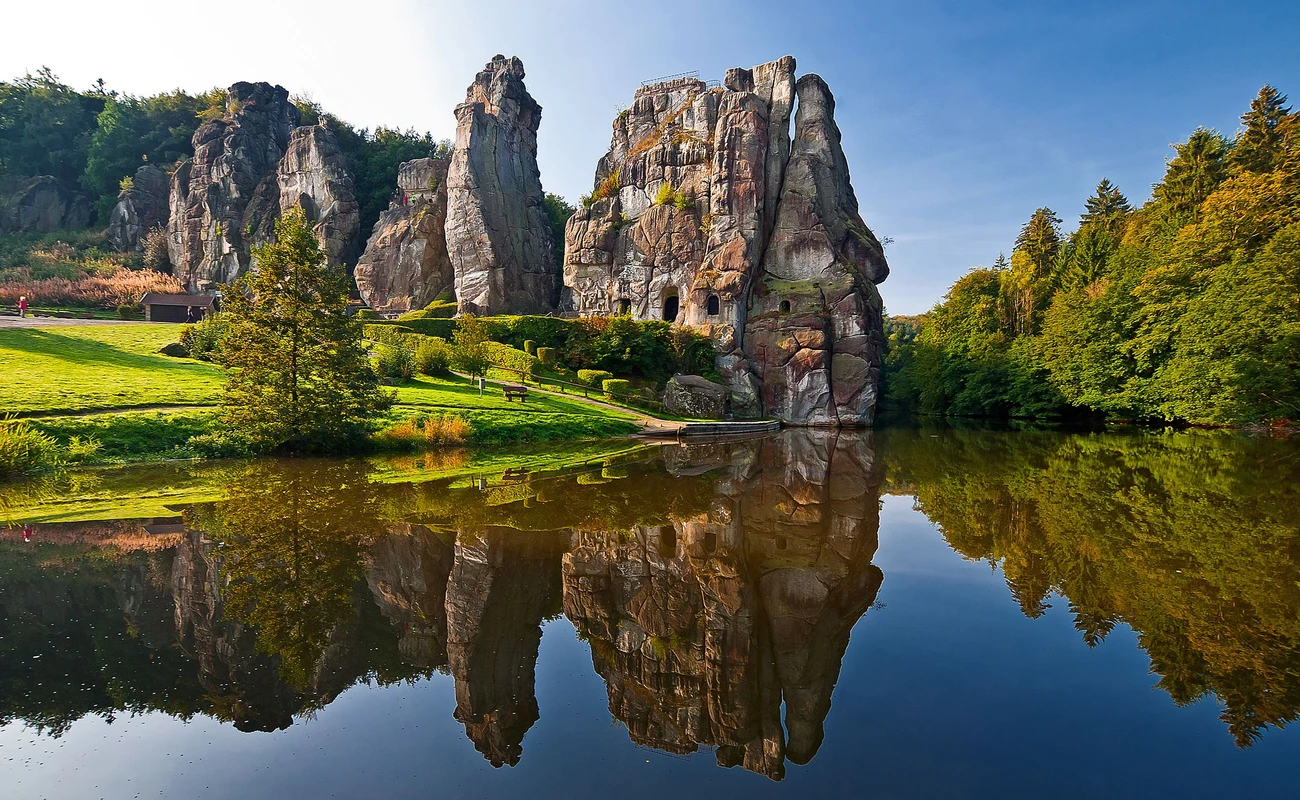 Genießen Sie die Annehmlichkeiten Ihres Hotels. Dazu zählt nicht nur der Wellnessbereich mit Hallenbad und Sauna (gegen Gebühr), sondern auch die Lage direkt am Kurpark. Alternativ können Sie an einem fakultativen Ausflug in den Teutoburger Wald teilnehmen (siehe ZL). Ihre Fahrt führt Sie zunächst nach Detmold, ins Herz des Teutoburger Waldes. In der Nähe erhebt sich das bekannte Hermannsdenkmal, das an die Schlacht im Jahr 9 nach Christus erinnert, bei der germanische Stämme die römischen Legionen besiegten. Anschließend besuchen Sie die Externsteine im Tal der Wiembecke – ein einzigartiges Natur- und Kulturdenkmal aus hoch aufragenden Felsformationen.